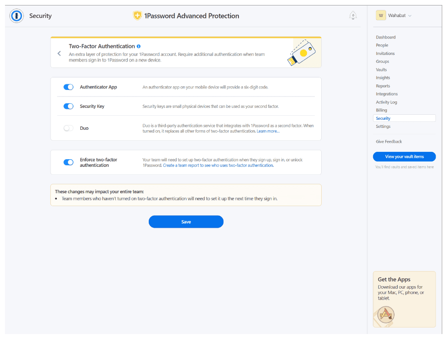 From there, you’ll see a bunch of options from 1Password Advanced Protection: